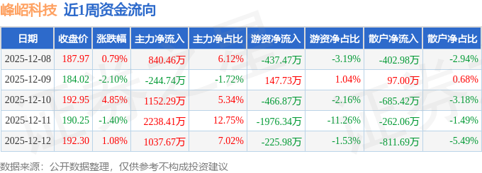 资金流向数据方面,本周峰岹科技主力资金合计净流入5024.08万元,游资资金合计净流出2958.93万元,散户资金合计净流出2065.15万元。本周资金流向一览见下表: