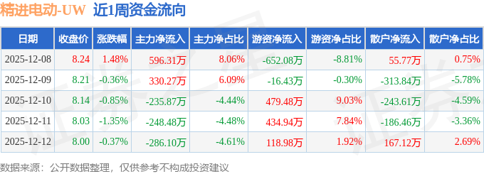 资金流向数据方面,本周精进电动主力资金合计净流入156.13万元,游资资金合计净流入364.88万元,散户资金合计净流出521.02万元。本周资金流向一览见下表: