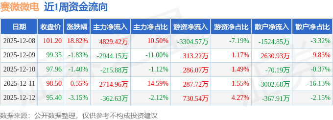 资金流向数据方面,本周赛微微电主力资金合计净流入4021.71万元,游资资金合计净流出1687.02万元,散户资金合计净流出2334.69万元。本周资金流向一览见下表: