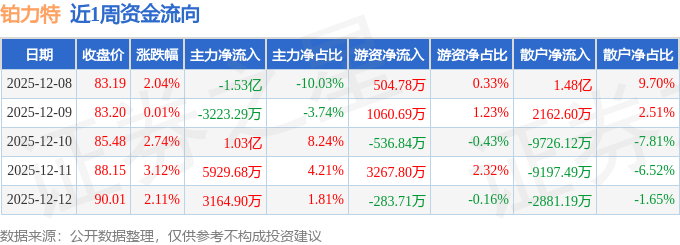 资金流向数据方面,本周铂力特主力资金合计净流入846.6万元,游资资金合计净流入4012.72万元,散户资金合计净流出4859.32万元。本周资金流向一览见下表: