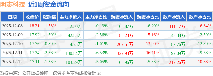 资金流向数据方面,本周明志科技主力资金合计净流出294.03万元,游资资金合计净流入393.83万元,散户资金合计净流出99.8万元。本周资金流向一览见下表: