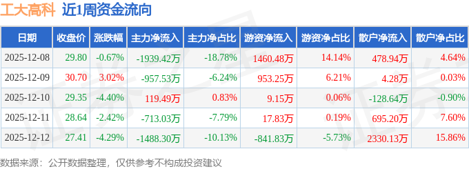 资金流向数据方面,本周工大高科主力资金合计净流出4978.79万元,游资资金合计净流入1598.88万元,散户资金合计净流入3379.91万元。本周资金流向一览见下表: