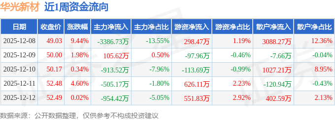 资金流向数据方面,本周华光新材主力资金合计净流出5654.23万元,游资资金合计净流入1264.76万元,散户资金合计净流入4389.47万元。本周资金流向一览见下表: