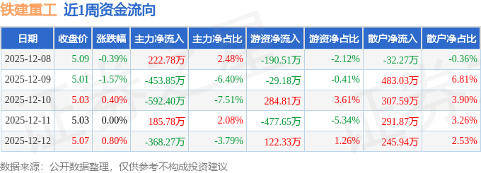 资金流向数据方面,本周铁建重工主力资金合计净流出1005.96万元,游资资金合计净流出290.19万元,散户资金合计净流入1296.15万元。本周资金流向一览见下表: