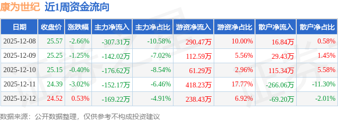 资金流向数据方面,本周康为世纪主力资金合计净流出947.35万元,游资资金合计净流入1121.01万元,散户资金合计净流出173.66万元。本周资金流向一览见下表: