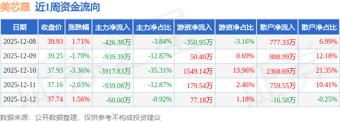 资金流向数据方面,本周美芯晟主力资金合计净流出6283.28万元,游资资金合计净流入1505.3万元,散户资金合计净流入4777.98万元。本周资金流向一览见下表: