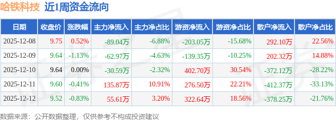 资金流向数据方面,本周哈铁科技主力资金合计净流入8.88万元,游资资金合计净流入659.44万元,散户资金合计净流出668.32万元。本周资金流向一览见下表: