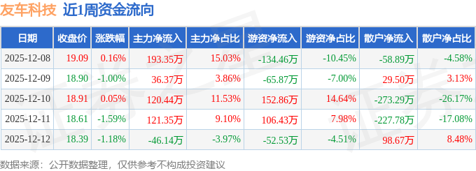 资金流向数据方面,本周友车科技主力资金合计净流入425.37万元,游资资金合计净流入6.43万元,散户资金合计净流出431.79万元。本周资金流向一览见下表: