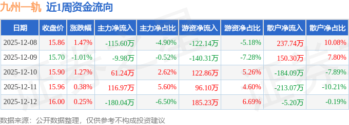 资金流向数据方面,本周九州一轨主力资金合计净流出127.41万元,游资资金合计净流入141.73万元,散户资金合计净流出14.32万元。本周资金流向一览见下表:
