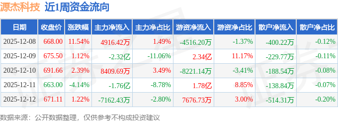 资金流向数据方面,本周源杰科技主力资金合计净流出3.47亿元,游资资金合计净流入3.61亿元,散户资金合计净流出1471.68万元。本周资金流向一览见下表: