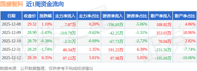 资金流向数据方面,本周国盛智科主力资金合计净流出167.77万元,游资资金合计净流出17.47万元,散户资金合计净流入185.24万元。本周资金流向一览见下表: