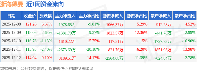 资金流向数据方面,本周浙海德曼主力资金合计净流出1234.39万元,游资资金合计净流入1264.54万元,散户资金合计净流出30.14万元。本周资金流向一览见下表: