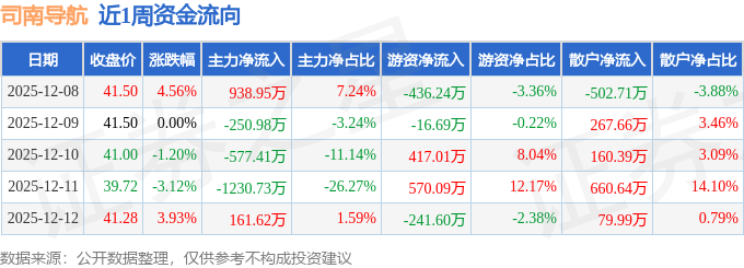 资金流向数据方面,本周司南导航主力资金合计净流出958.54万元,游资资金合计净流入292.57万元,散户资金合计净流入665.97万元。本周资金流向一览见下表:
