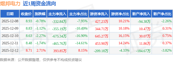 资金流向数据方面,本周煜邦电力主力资金合计净流出1435.27万元,游资资金合计净流入1661.93万元,散户资金合计净流出226.65万元。本周资金流向一览见下表: