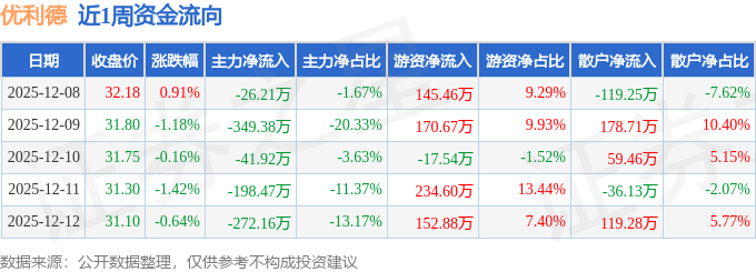 资金流向数据方面,本周优利德主力资金合计净流出888.14万元,游资资金合计净流入686.07万元,散户资金合计净流入202.07万元。本周资金流向一览见下表: