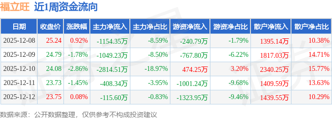资金流向数据方面,本周福立旺主力资金合计净流出5542.03万元,游资资金合计净流出2859.53万元,散户资金合计净流入8401.56万元。本周资金流向一览见下表: