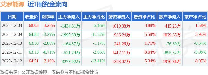 资金流向数据方面,本周艾罗能源主力资金合计净流出7391.08万元,游资资金合计净流入4947.05万元,散户资金合计净流入2444.03万元。本周资金流向一览见下表: