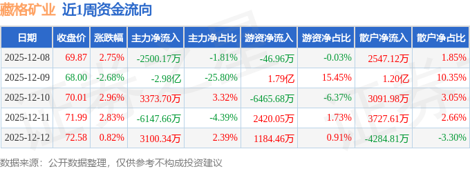 资金流向数据方面,本周藏格矿业主力资金合计净流出3.2亿元,游资资金合计净流入1.5亿元,散户资金合计净流入1.71亿元。本周资金流向一览见下表: