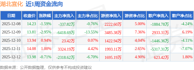 资金流向数据方面,本周湖北宜化主力资金合计净流出5727.51万元,游资资金合计净流入1.08亿元,散户资金合计净流出5091.71万元。本周资金流向一览见下表: