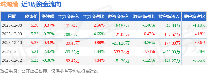 资金流向数据方面,本周珠海港主力资金合计净流入35.59万元,游资资金合计净流入225.29万元,散户资金合计净流出260.87万元。本周资金流向一览见下表: