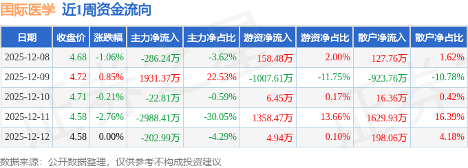 资金流向数据方面,本周国际医学主力资金合计净流出1569.08万元,游资资金合计净流入520.73万元,散户资金合计净流入1048.35万元。本周资金流向一览见下表:
