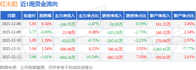 资金流向数据方面,本周红太阳主力资金合计净流出295.99万元,游资资金合计净流入788.76万元,散户资金合计净流出492.77万元。本周资金流向一览见下表: