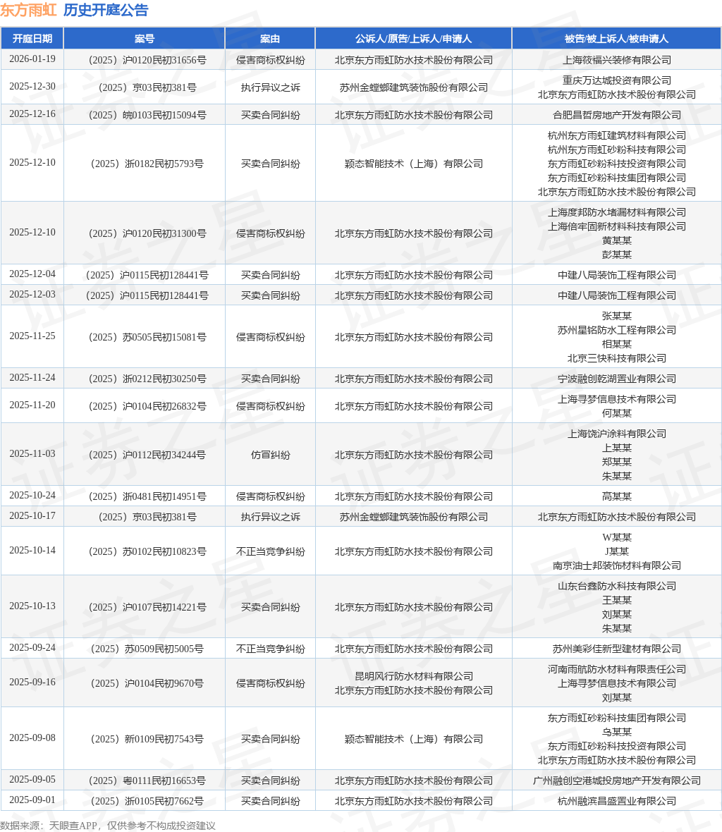 案号:(2025)皖0103民初15094号根据统计,近一年内以北京东方雨虹防水技术股份有限公司为当事人的历史开庭公告有85则,其中案由为“买卖合同纠纷”的公告以30则居首,其次为“侵害商标权纠纷”有17则,“不正当竞争纠纷”有8则。历史开庭公告(前20条)如下: