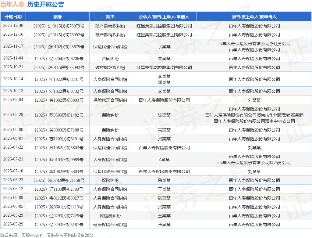 证券之星消息,根据天眼查APP显示,近日公布了一则百年人寿保险股份有限公司作为被告/被上诉人的开庭公告,详细内容如下: