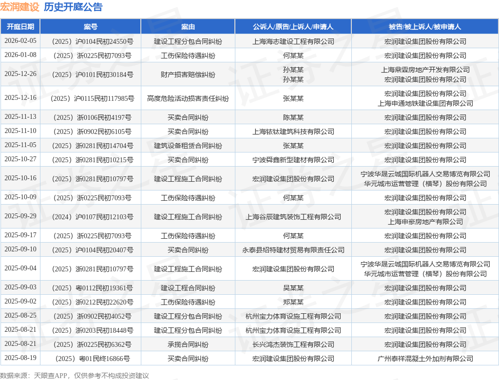 案号:(2025)沪0115民初117985号根据统计,近一年内以宏润建设集团股份有限公司为当事人的历史开庭公告有52则,其中案由为“买卖合同纠纷”的公告以17则居首,其次为“建设工程施工合同纠纷”有9则,“建设工程分包合同纠纷”有6则。历史开庭公告(前20条)如下: