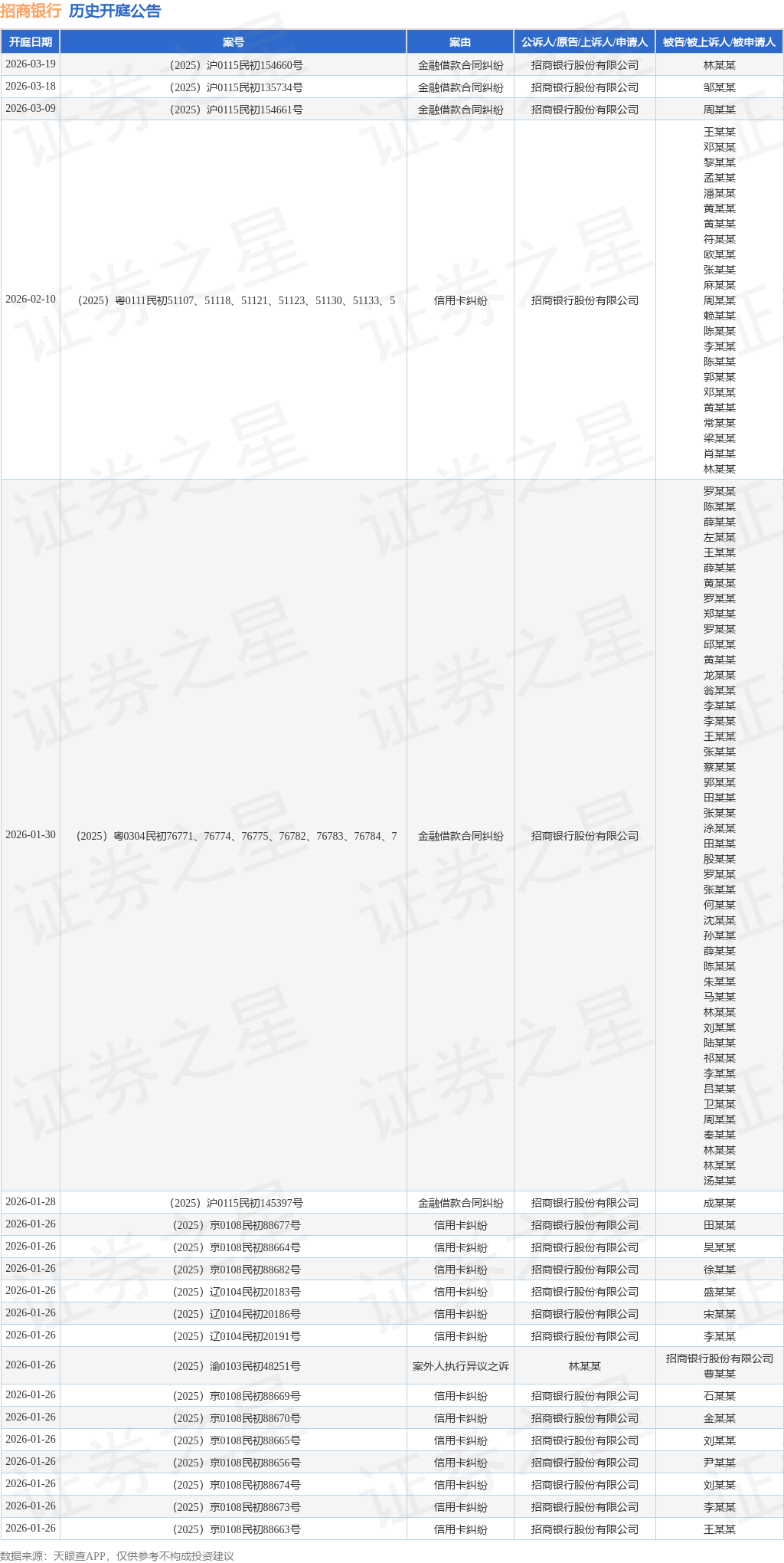 案号:(2025)辽0103民初13515号根据统计,近一年内以招商银行股份有限公司为当事人的历史开庭公告有888则,其中案由为“信用卡纠纷”的公告以466则居首,其次为“金融借款合同纠纷”有346则,“借款合同纠纷”有37则。历史开庭公告(前20条)如下: