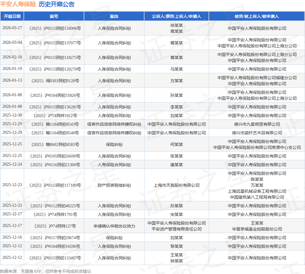 案号:(2025)沪0117民初29674号根据统计,近一年内以中国平安人寿保险股份有限公司为当事人的历史开庭公告有400则,其中案由为“人身保险合同纠纷”的公告以241则居首,其次为“保险纠纷”有36则,“保险代理合同纠纷”有35则。历史开庭公告(前20条)如下: