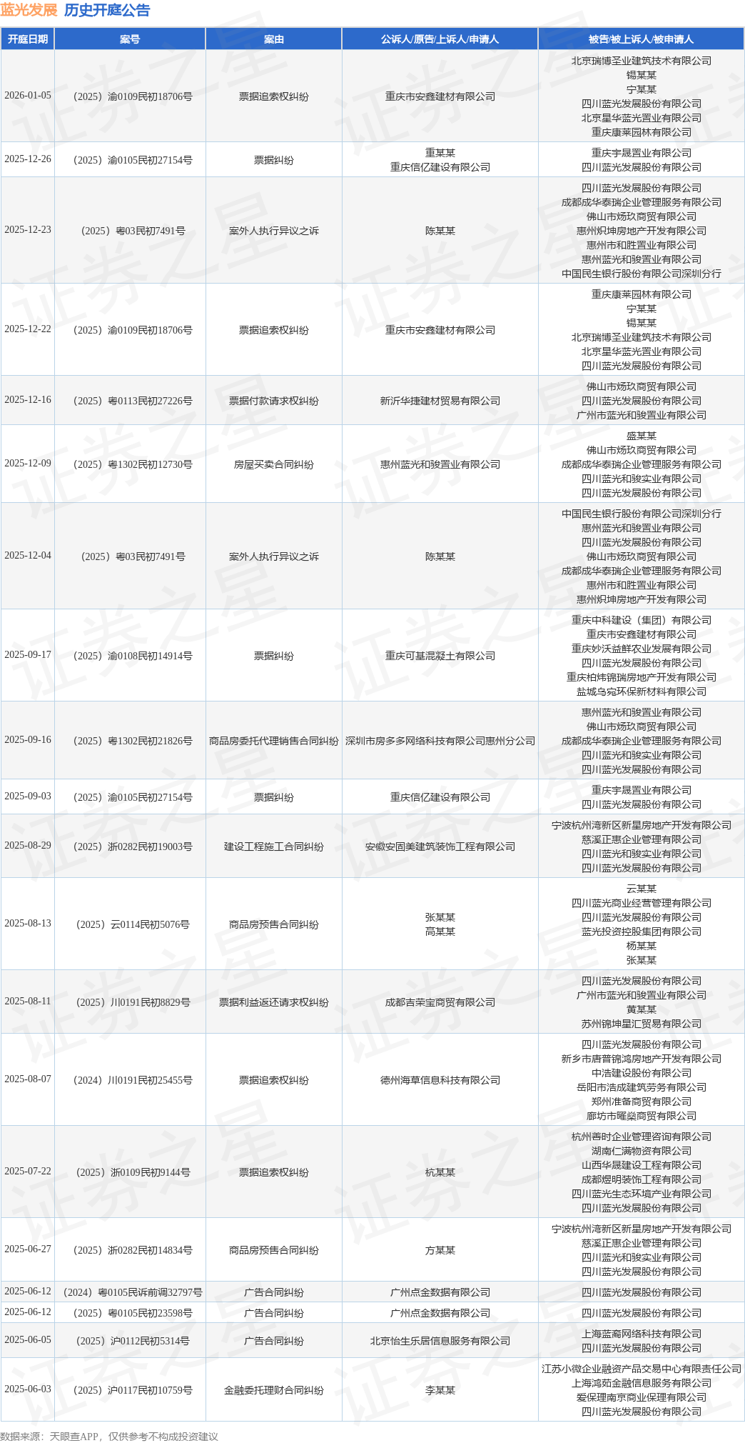 案号:(2025)粤0113民初27226号根据统计,近一年内以四川蓝光发展股份有限公司为当事人的历史开庭公告有84则,其中案由为“合同纠纷”的公告以31则居首,其次为“票据追索权纠纷”有15则,“票据纠纷”有9则。历史开庭公告(前20条)如下:
