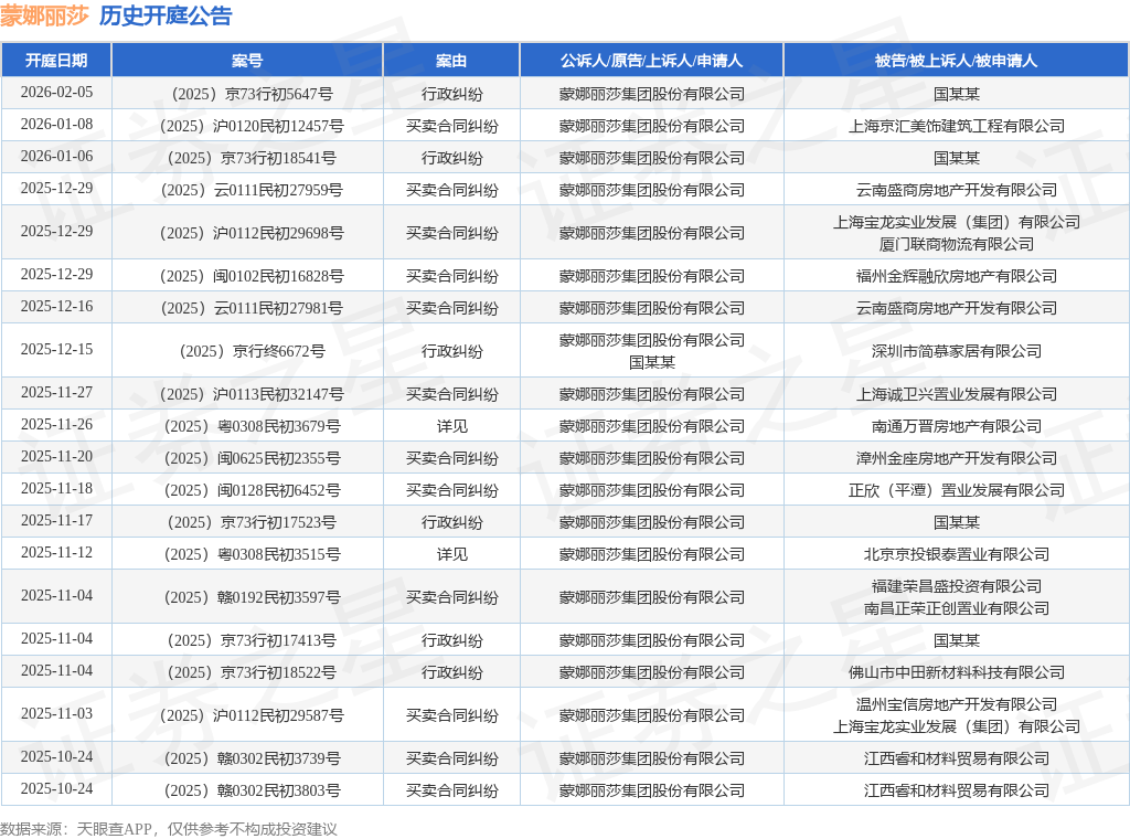 案号:(2025)云0111民初27981号根据统计,近一年内以蒙娜丽莎集团股份有限公司为当事人的历史开庭公告有207则,其中案由为“买卖合同纠纷”的公告以143则居首,其次为“行政纠纷”有34则,“其他”有10则。历史开庭公告(前20条)如下:
