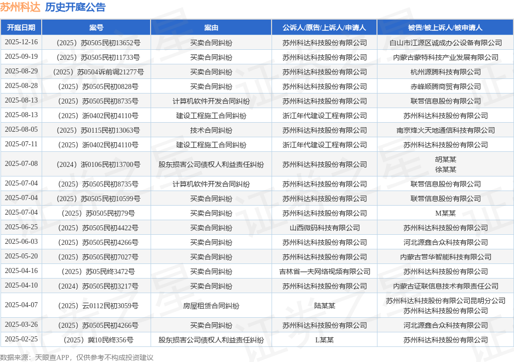 案号:(2025)苏0505民初13652号根据统计,近一年内以苏州科达科技股份有限公司为当事人的历史开庭公告有24则,其中案由为“买卖合同纠纷”的公告以15则居首,其次为“股东损害公司债权人利益责任纠纷”有3则,“建设工程施工合同纠纷”有2则。历史开庭公告(前20条)如下: