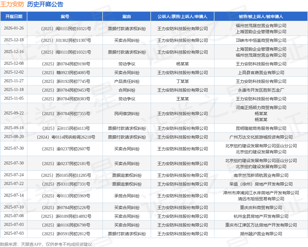 案号:(2025)闽0111民初10321号根据统计,近一年内以王力安防科技股份有限公司为当事人的历史开庭公告有73则,其中案由为“票据追索权纠纷”的公告以14则居首,其次为“买卖合同纠纷”有13则,“票据付款请求权纠纷”有12则。历史开庭公告(前20条)如下: