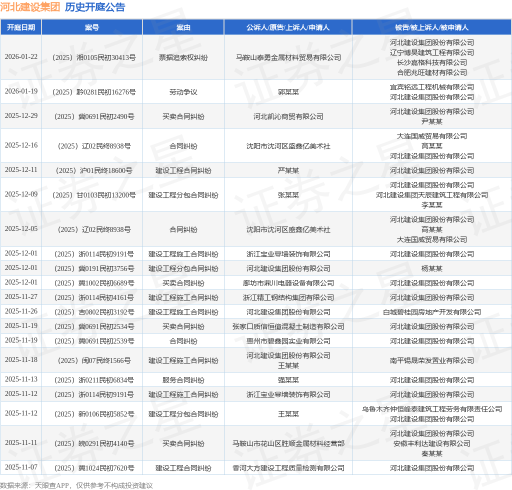 案号:(2025)辽02民终8938号根据统计,近一年内以河北建设集团股份有限公司为当事人的历史开庭公告有1397则,其中案由为“买卖合同纠纷”的公告以574则居首,其次为“建设工程施工合同纠纷”有195则,“劳务合同纠纷”有114则。历史开庭公告(前20条)如下: