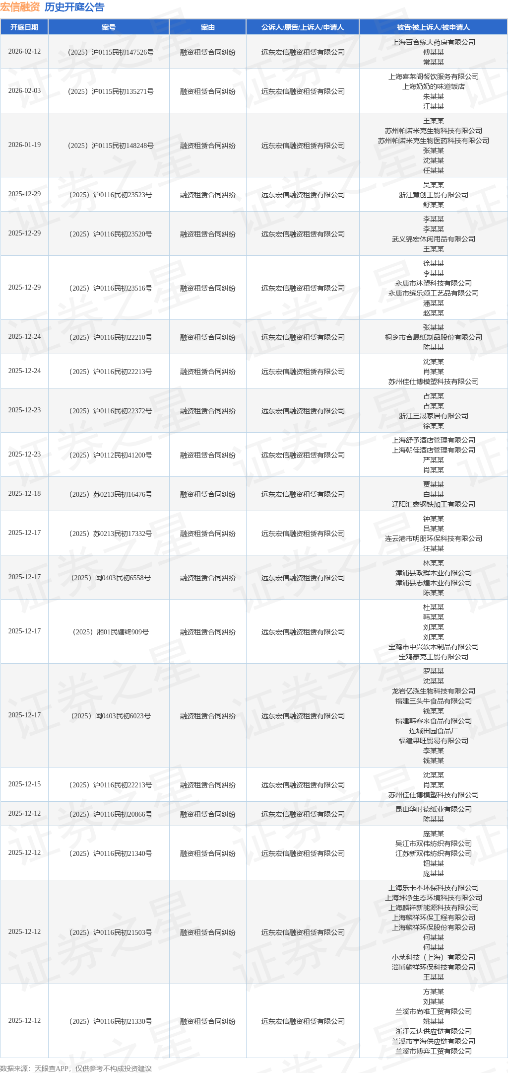 案号:(2025)沪0116民初22213号根据统计,近一年内以远东宏信融资租赁有限公司为当事人的历史开庭公告有143则,其中案由为“融资租赁合同纠纷”的公告以140则居首,其次为“租赁合同”有2则,“执行异议之诉”有1则。历史开庭公告(前20条)如下:
