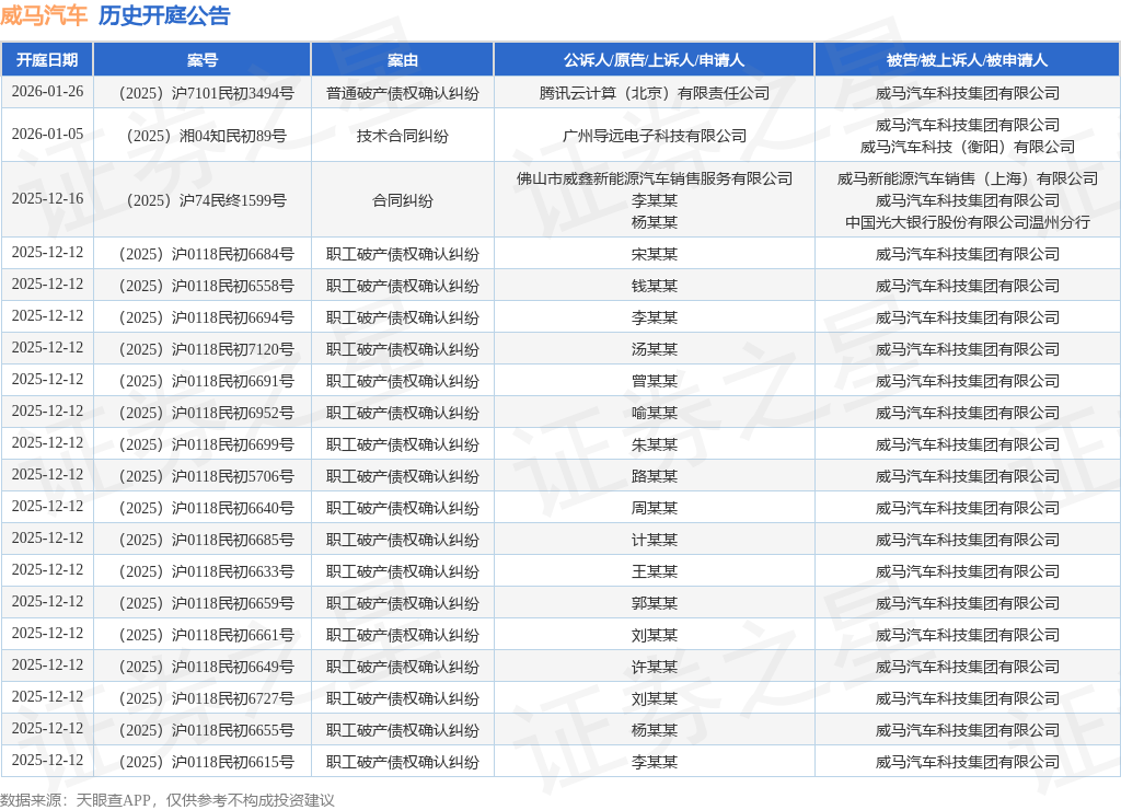 案号:(2025)沪74民终1599号根据统计,近一年内以威马汽车科技集团有限公司为当事人的历史开庭公告有80则,其中案由为“职工破产债权确认纠纷”的公告以65则居首,其次为“普通破产债权确认纠纷”有5则,“合同纠纷”有2则。历史开庭公告(前20条)如下:
