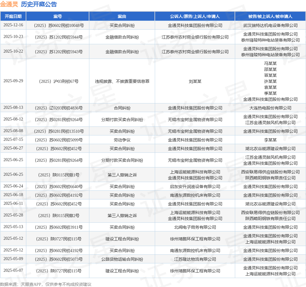 案号:(2025)苏0602民初10048号根据统计,近一年内以金通灵科技集团股份有限公司为当事人的历史开庭公告有39则,其中案由为“买卖合同纠纷”的公告以18则居首,其次为“建设工程合同纠纷”有3则,“承揽合同纠纷”有3则。历史开庭公告(前20条)如下: