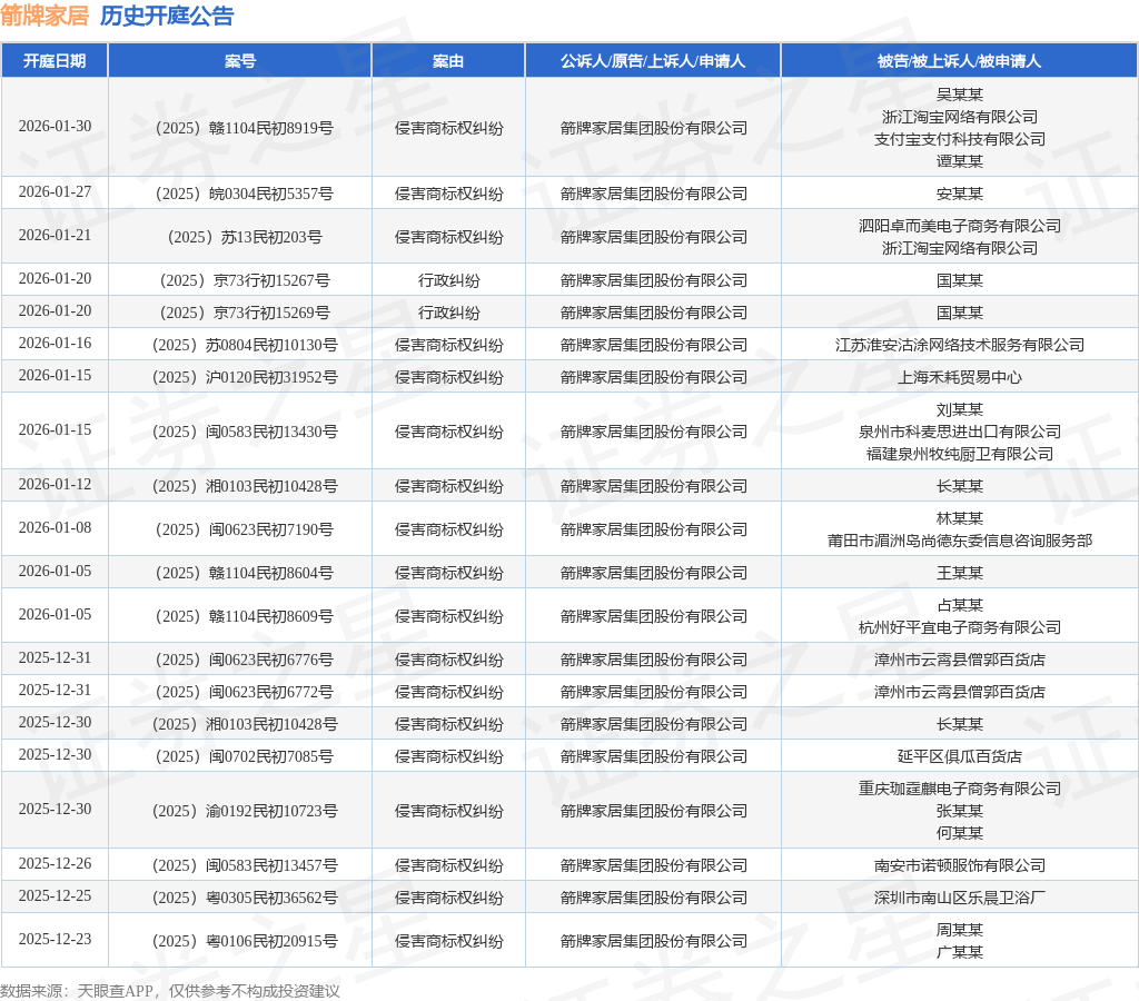 案号:(2025)闽0503民初21260号根据统计,近一年内以箭牌家居集团股份有限公司为当事人的历史开庭公告有477则,其中案由为“侵害商标权纠纷”的公告以419则居首,其次为“商标权权属、侵权纠纷”有16则,“行政纠纷”有8则。历史开庭公告(前20条)如下: