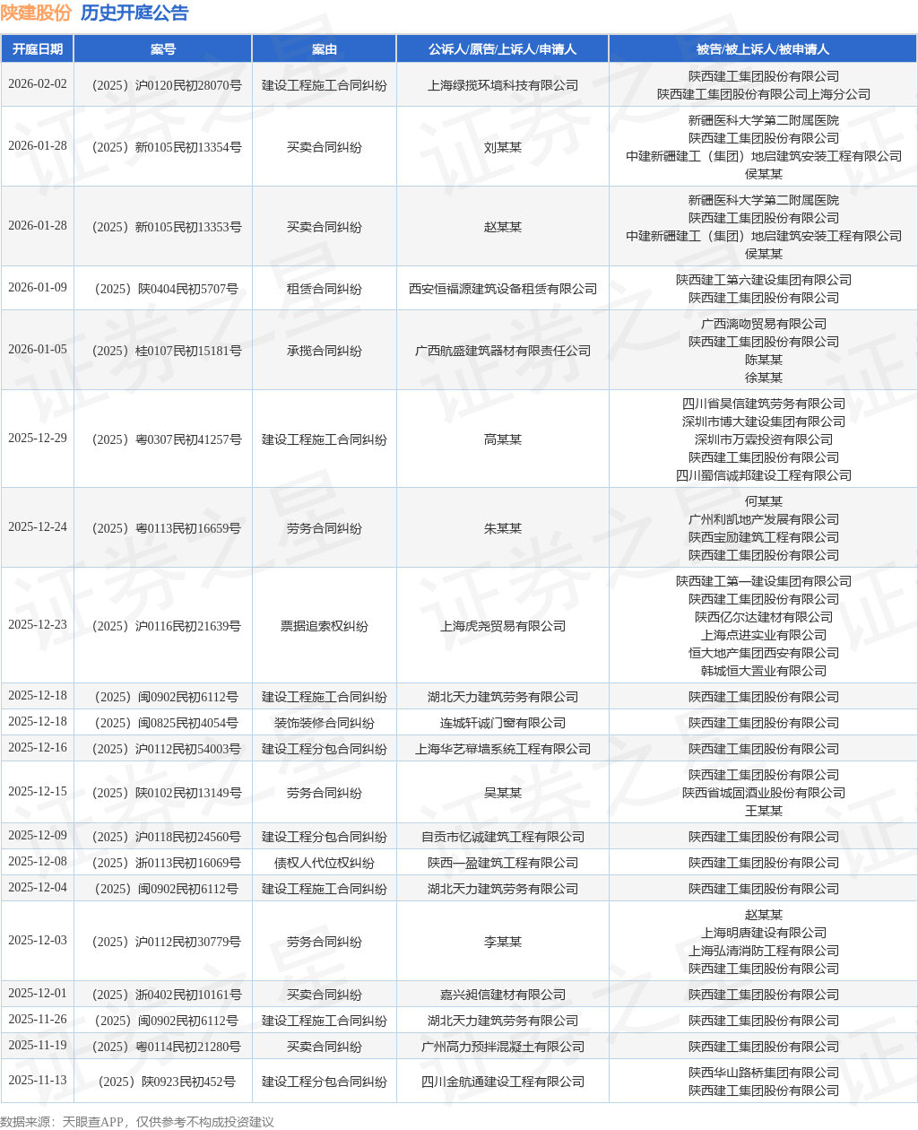 案号:(2025)沪0112民初54003号根据统计,近一年内以陕西建工集团股份有限公司为当事人的历史开庭公告有256则,其中案由为“建设工程施工合同纠纷”的公告以61则居首,其次为“买卖合同纠纷”有49则,“建设工程分包合同纠纷”有32则。历史开庭公告(前20条)如下:
