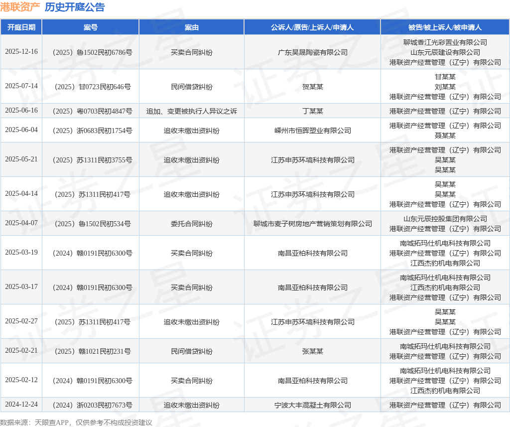 案号:(2025)鲁1502民初6786号根据统计,近一年内以港联资产经营管理(辽宁)有限公司为当事人的历史开庭公告有13则,其中案由为“追收未缴出资纠纷”的公告以5则居首,其次为“买卖合同纠纷”有4则,“民间借贷纠纷”有2则。历史开庭公告如下: