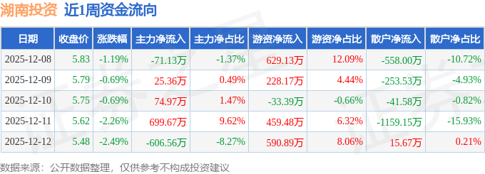 资金流向数据方面,本周湖南投资主力资金合计净流入122.32万元,游资资金合计净流入1874.27万元,散户资金合计净流出1996.59万元。本周资金流向一览见下表: