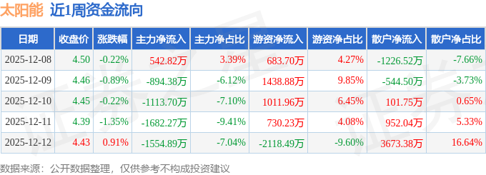 沪深股通持股方面,截止2025年12月12日收盘,太阳能深股通持股数为3418.9万股,占流通股比为95.0%。