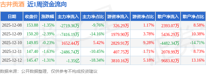 资金流向数据方面,本周古井贡酒主力资金合计净流出2.45亿元,游资资金合计净流入9354.01万元,散户资金合计净流入1.51亿元。本周资金流向一览见下表: