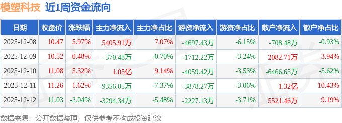 资金流向数据方面,本周模塑科技主力资金合计净流入2911.1万元,游资资金合计净流出1.66亿元,散户资金合计净流入1.37亿元。本周资金流向一览见下表: