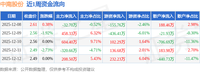 沪深股通持股方面,截止2025年12月12日收盘,中南股份深股通持股数为1395.11万股,占流通股比为58.0%。