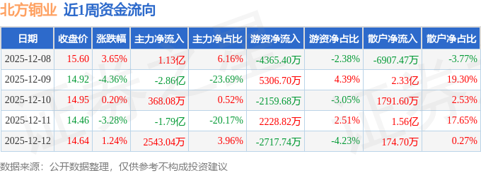 资金流向数据方面,本周北方铜业主力资金合计净流出3.23亿元,游资资金合计净流出1707.31万元,散户资金合计净流入3.4亿元。本周资金流向一览见下表: