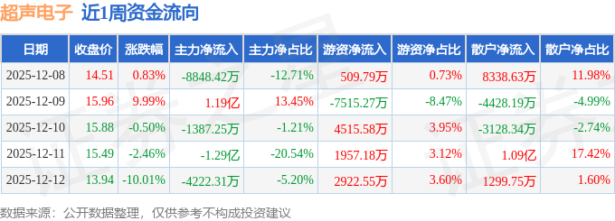 资金流向数据方面,本周超声电子主力资金合计净流出1.54亿元,游资资金合计净流入2389.84万元,散户资金合计净流入1.3亿元。本周资金流向一览见下表:
