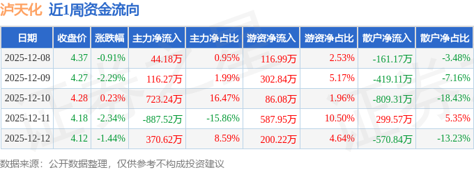 资金流向数据方面,本周泸天化主力资金合计净流入366.79万元,游资资金合计净流入1294.07万元,散户资金合计净流出1660.86万元。本周资金流向一览见下表: